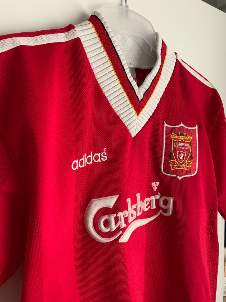 It was however, cold. And I’m not talking about the kind of chill that makes your fingers go numb, I’m talking about the kind that can freeze the tears inside your eyes. The kind of cold that soaks into your bones and makes you feel like your muscles will turn brittle and shatter like the bad Terminator at the end of Judgement Day. So while I did have a hat and gloves on, there was no need for a scarf because back in 1995 Adidas decided to build one into Liverpool’s home shirt, which I’m wearing today.