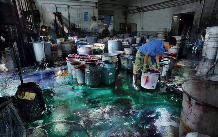Aside from the aforementioned polyester (Polyethylene Terephthalate, or PET if you want to get technical), there’s various acids, alcohols, dyes and bleach all used in the production of a shirt. It also can take around 25 litres of water just to dye one shirt, and once it’s done 20% of the dye stays in that water. Treating the water to rid these chemicals and make it safe again is a complex and expensive process that bafflingly requires *more* chemicals, so instead it usually just gets dumped back into rivers and waterways by unscrupulous factory owners and authorities that turn a blind eye. The Citarum river (Indonesia) and Pearl river (China) are now completely unsafe for humans in part because of the factories that line their banks. To get an idea of the sheer scale of this problem, aside from the agriculture industry, the second biggest polluter of water in the world is the textile business.